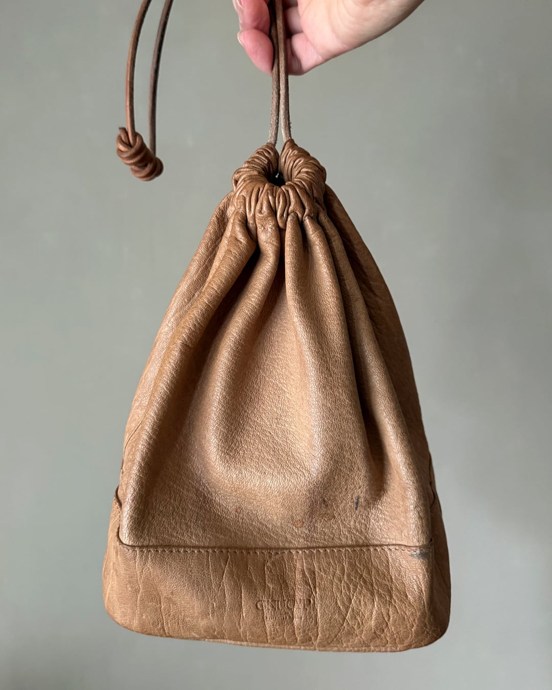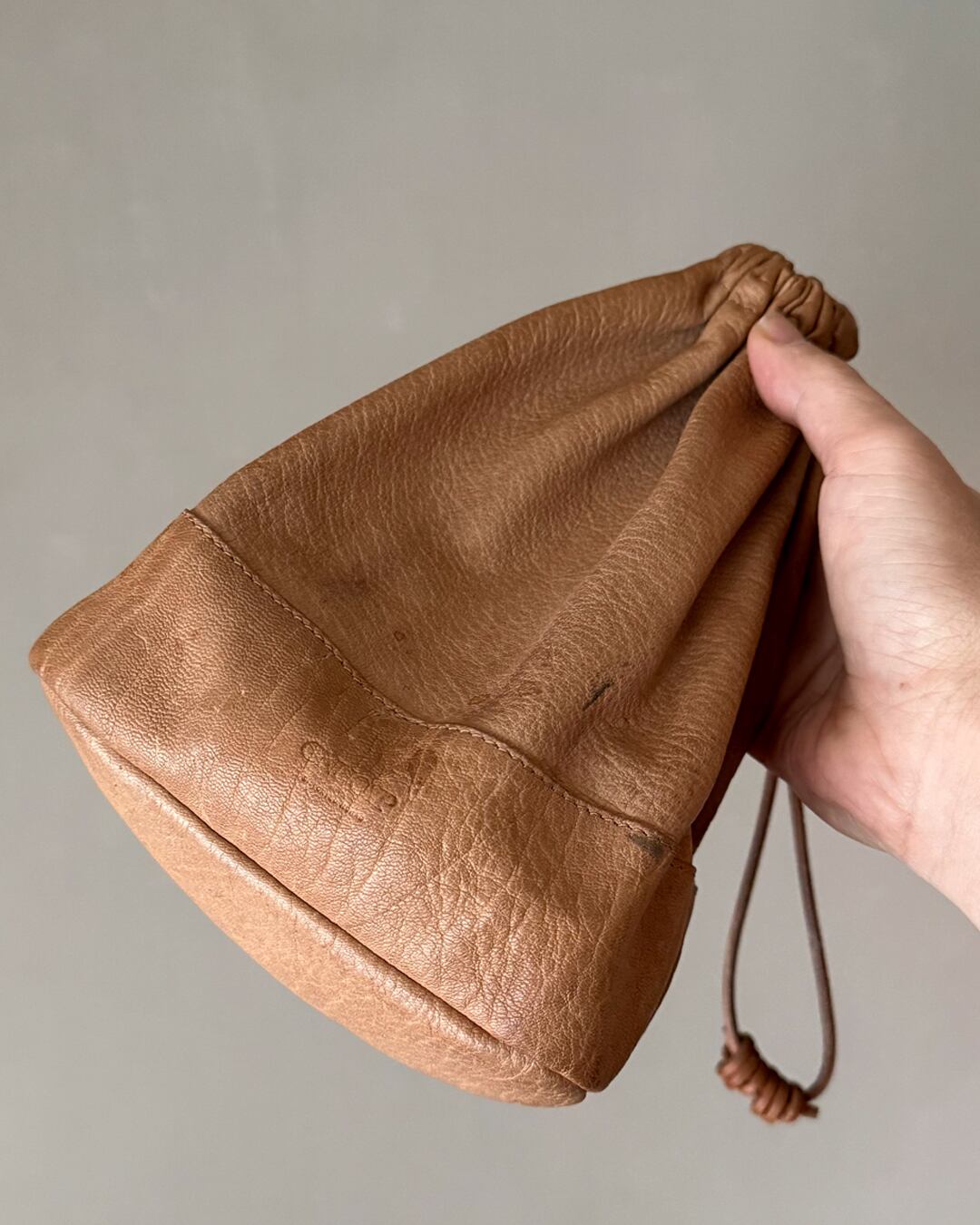 底面を四角く仕上げ、丁度良いサイズに致しました。クシュっとした口元は革の厚み削ぎ落とす職人技の見せ処。使い込む事で味わい深い風合いに育っていきます