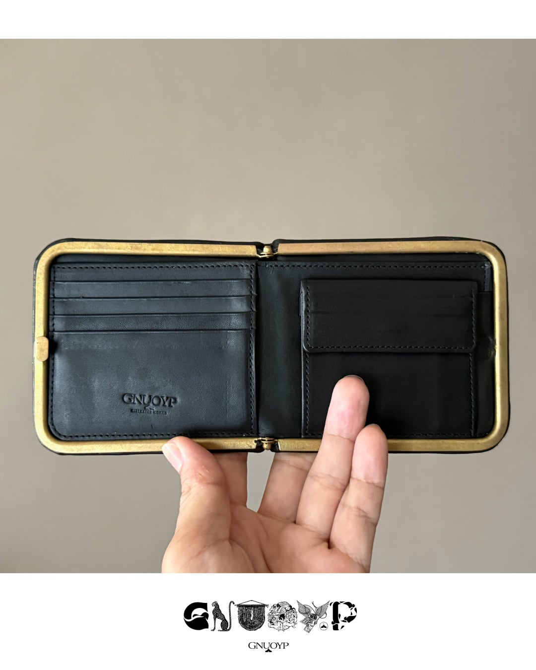 特徴的な口金は今では珍しい真鍮素材を使い1点1点手作りで仕上ています。革だけでなく口金も経年変化をお楽しみ頂けます。