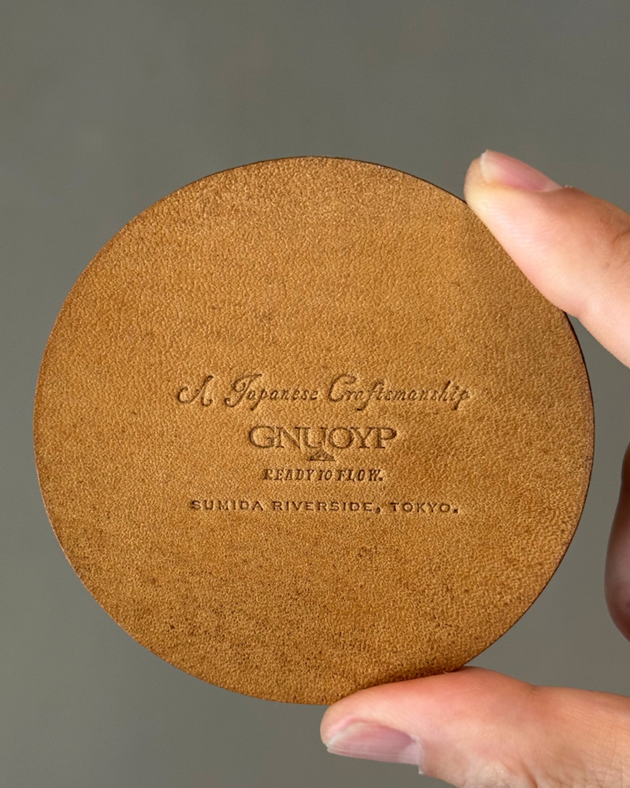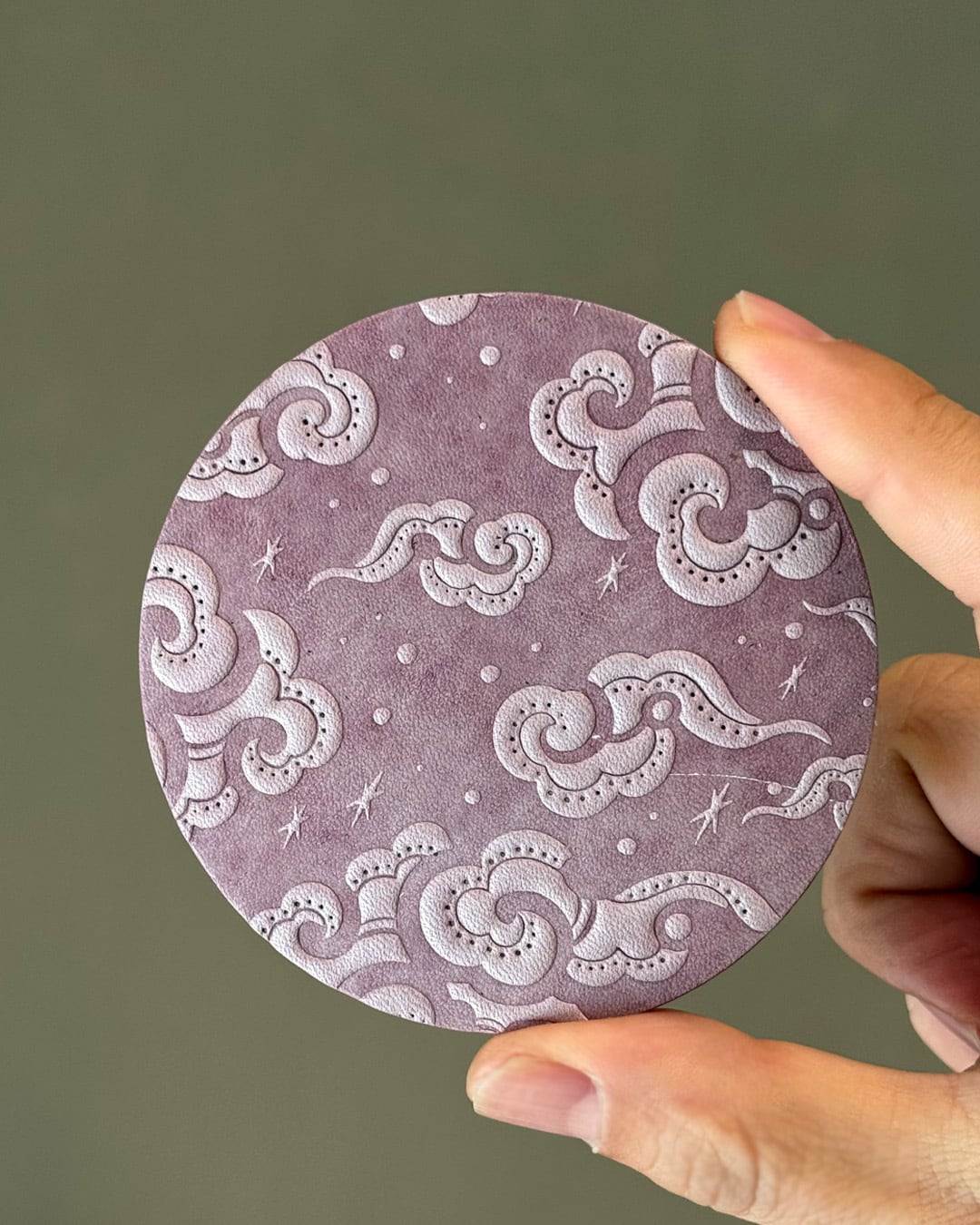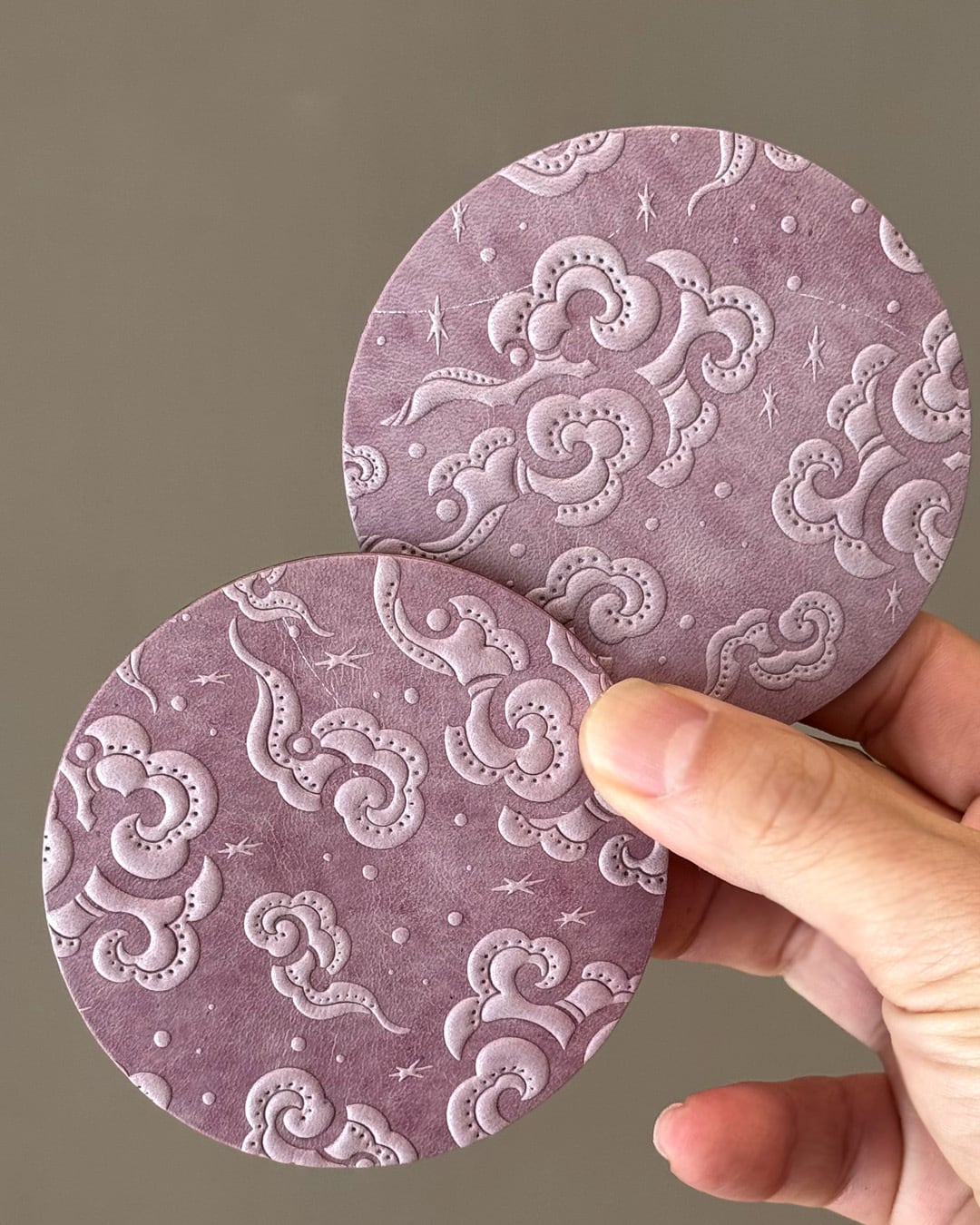 縁起の良い吉祥模様をあしらったレザーコースター。型押しする事でモコっとした遊雲を浮かび上がらせました。使い込むと味のある游雲に育っていきます。 *游雲の入り方は1つ1つ異なりお選びすることは出来ません。