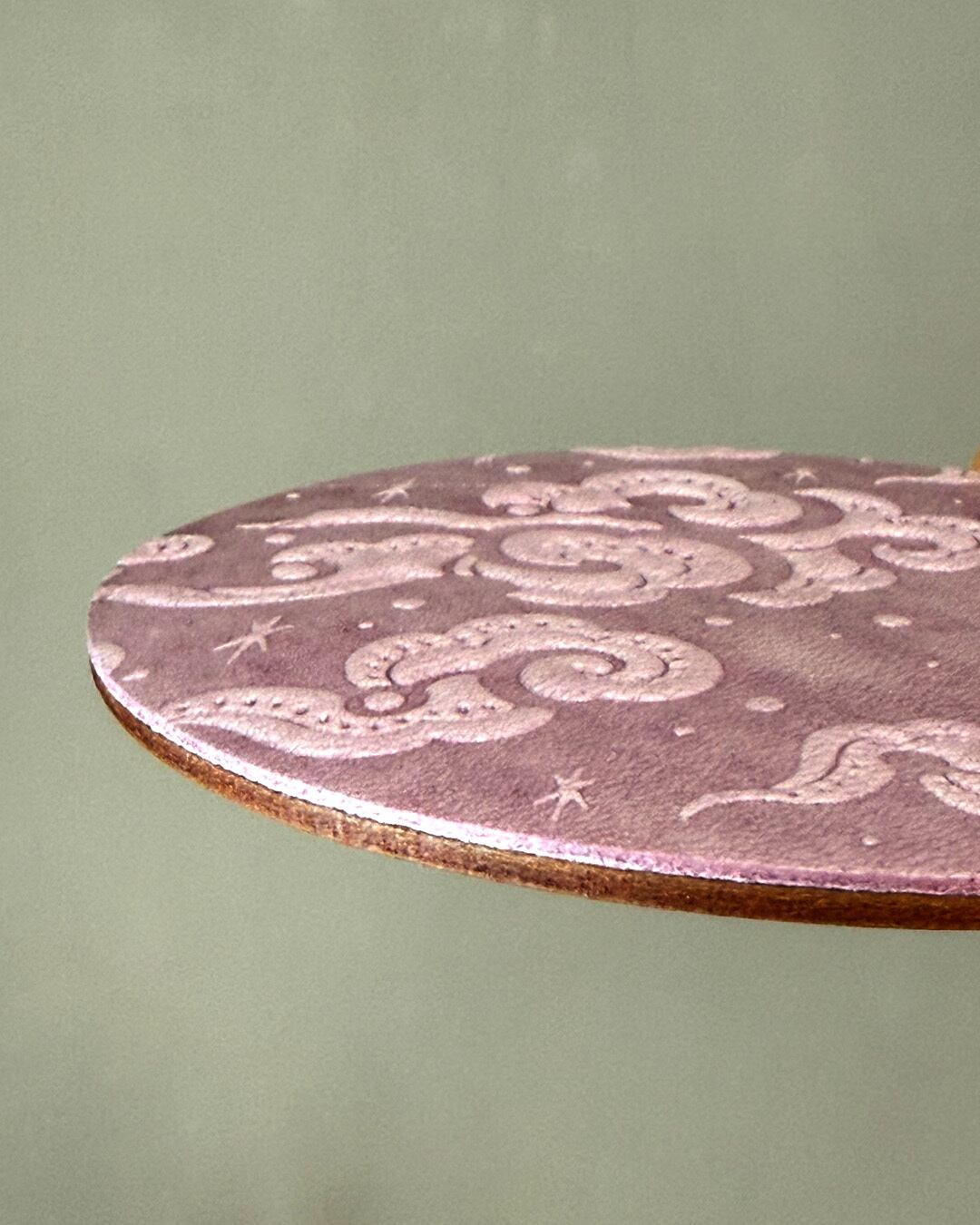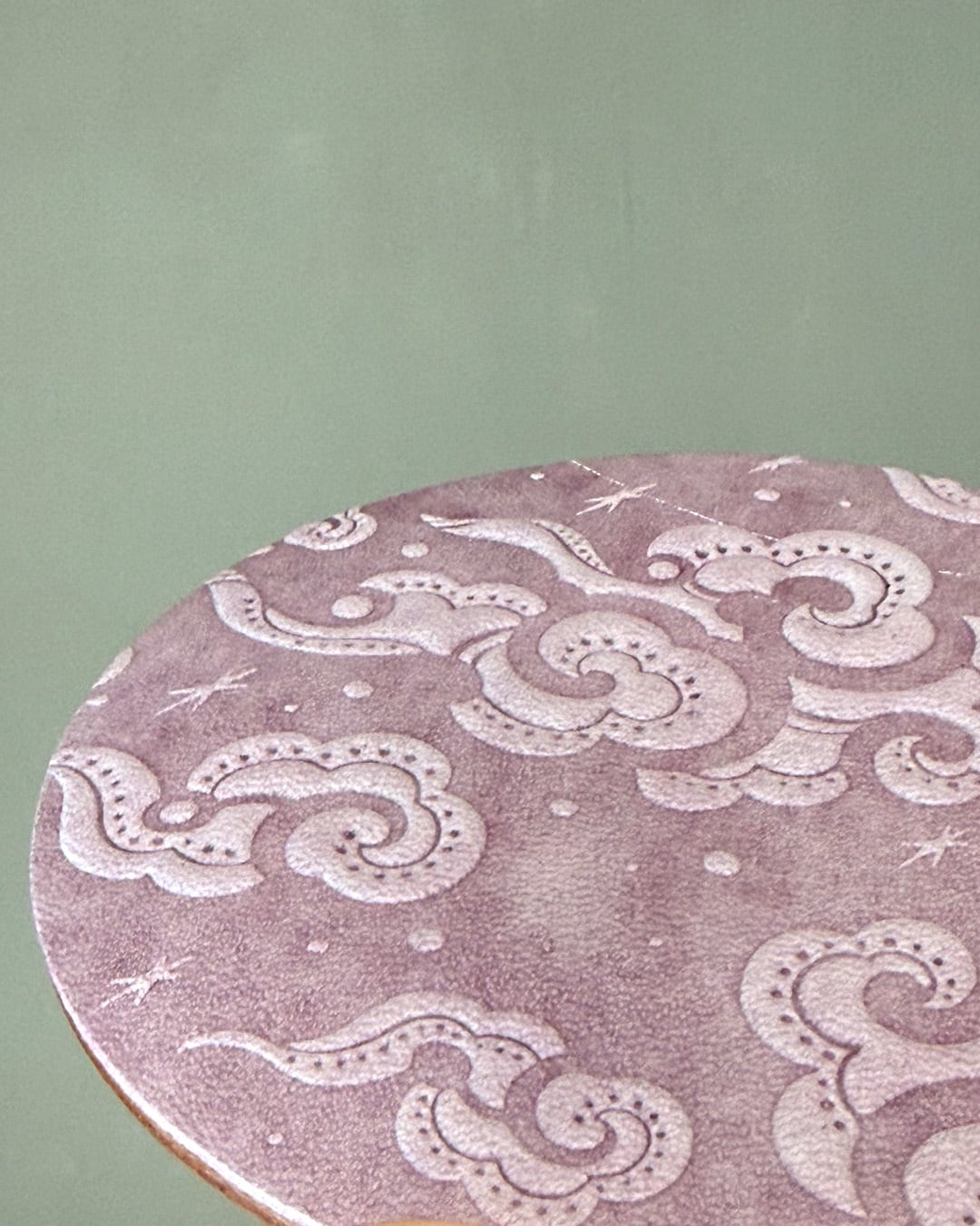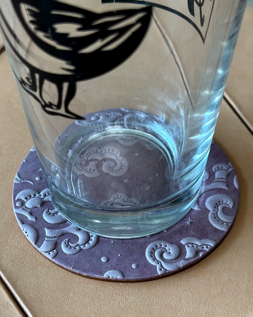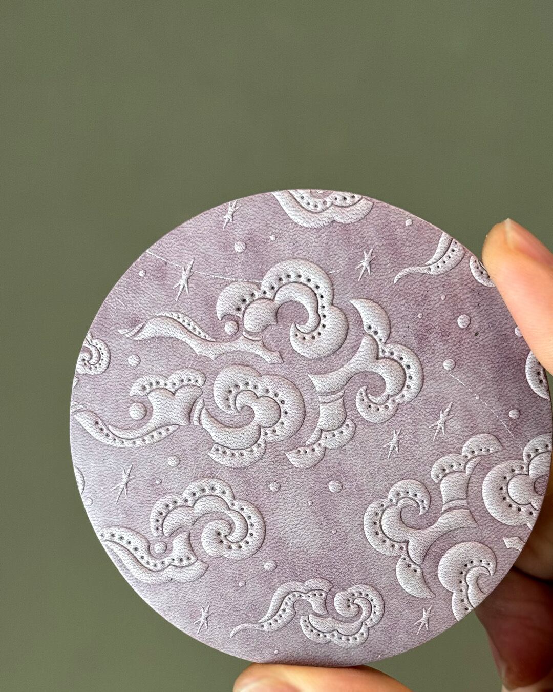 縁起の良い吉祥模様をあしらったレザーコースター。型押しする事でモコっとした遊雲を浮かび上がらせました。使い込むと味のある游雲に育っていきます。 *游雲の入り方は1つ1つ異なりお選びすることは出来ません。