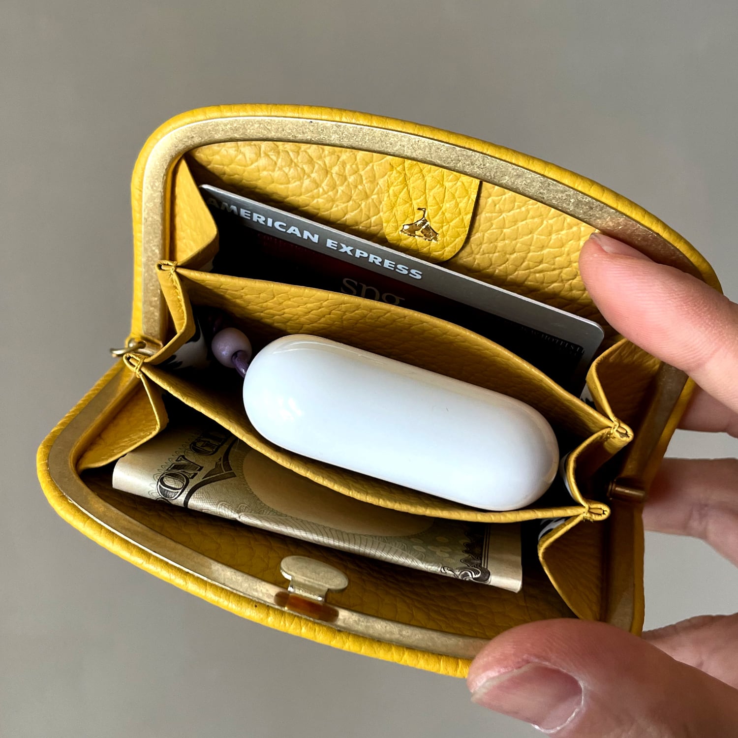 余談ですがAirPodsの様な厚みのあるものでも収納可能です。薄くても十分な収納力を持ち合わせたコンパクトウォレットです。もちろん車のキーなども収納可能です。