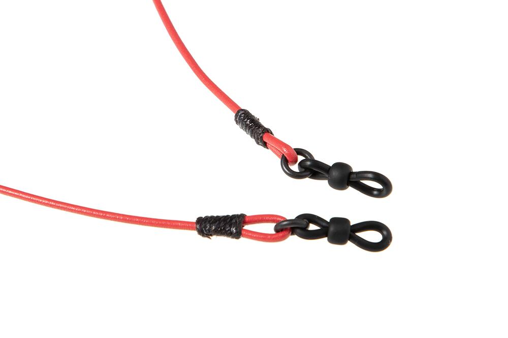 かがり糸は手縫いの時に使用する太番手のロウ引き糸を使用し締めています。フック部分はゴム製になっているので収縮し、はずれにくく、どんなサイズのメガネにも差し込みやすくなっています。中央のビーズで調整してご使用ください。