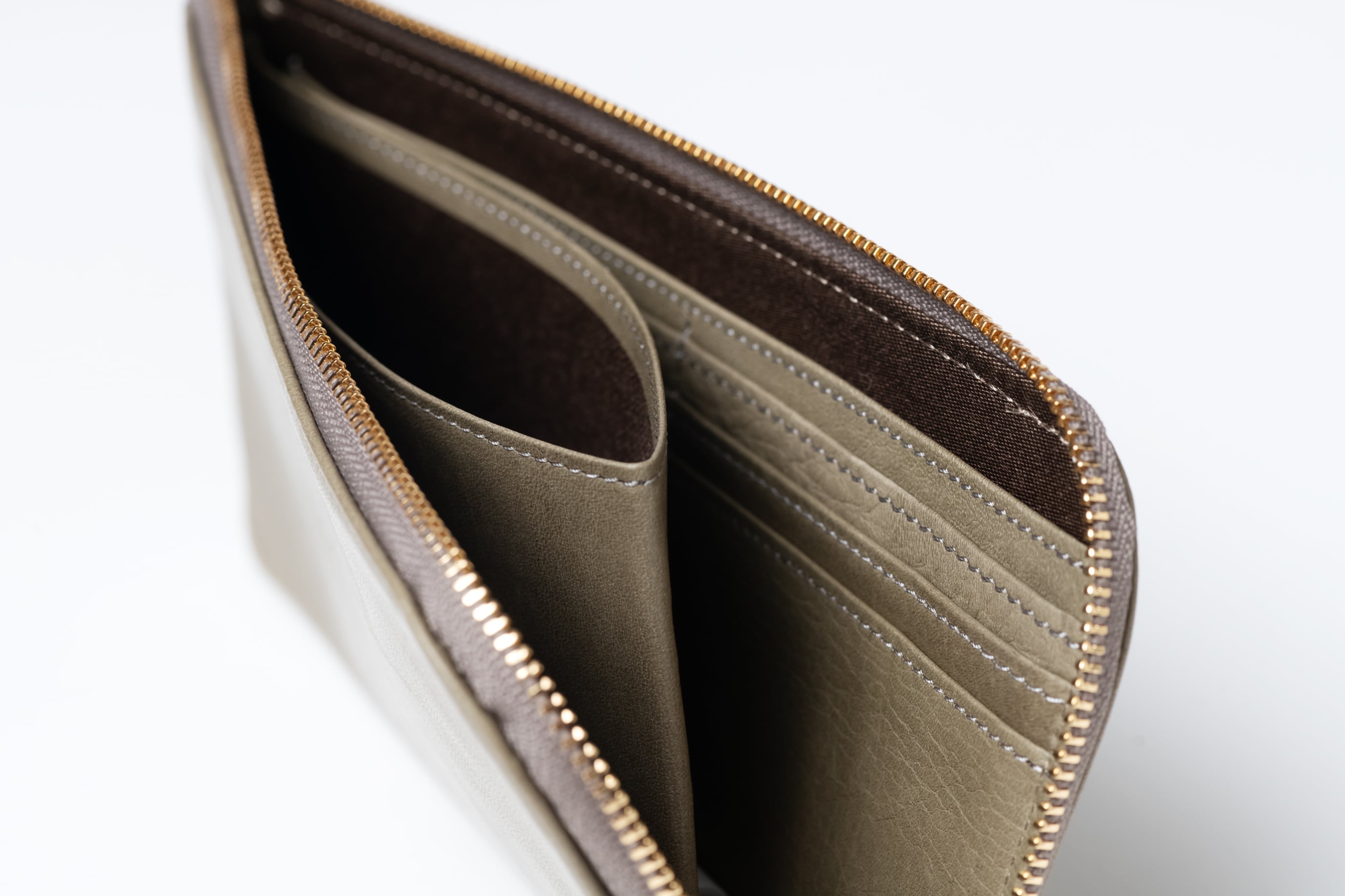 使い込むほどに美しい光沢が現れる、しなやかなオイルレザーを使用。L字型のジップで開閉するロングウォレットはとても開閉がよく整理整頓しやすいお財布です。BLCKのライニングには上品なペイズリー柄をGRAYには光沢のあるブラウンを使用。内側の収納は、中央の部分にコインを、両サイドの収納にはカードが複数枚入るつくりで、その間には紙幣が折らずに収まります。マチが薄いのでかさ張りにくく、ジップは磨きの掛かったYKKを使用しています。