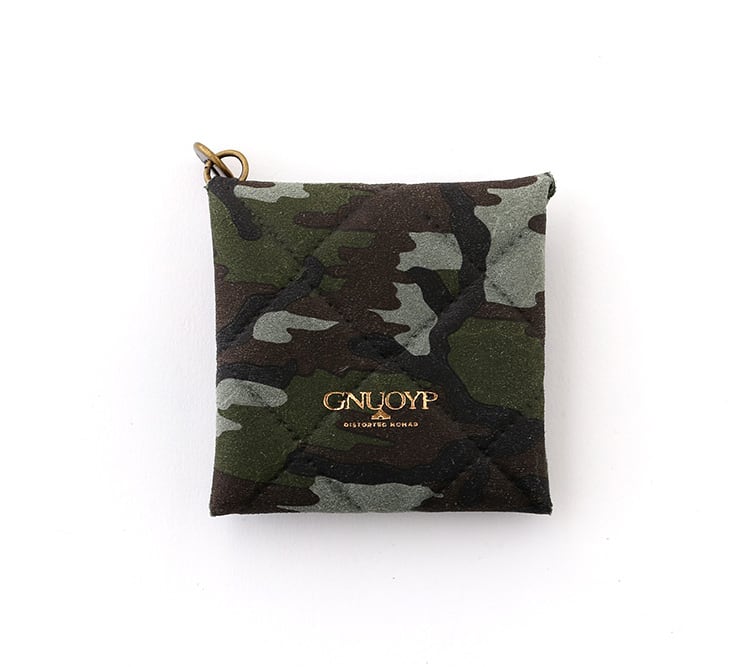 革の表面を削り迷彩柄をプリント。仕上げにキルティングの型押しをしたアイテムです。