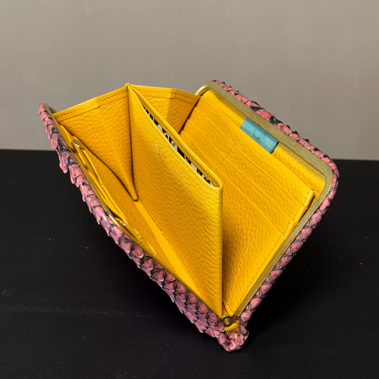 バッグカットの鱗と品の良いピンクが特徴的なヘビ革のスペシャルな長財布です。