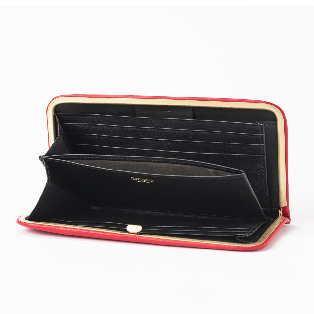 ワンタッチで簡単に開閉する薄型財布「天溝LONG」です。口が大きく開くので中身の視認性が高く、手の収まりが良いのが特徴です。がまぐち一筋50年の熟練職人と作るキャッシュレス時代に丁度よい薄型でかさばらない新しいタイプのロングウォレットです。