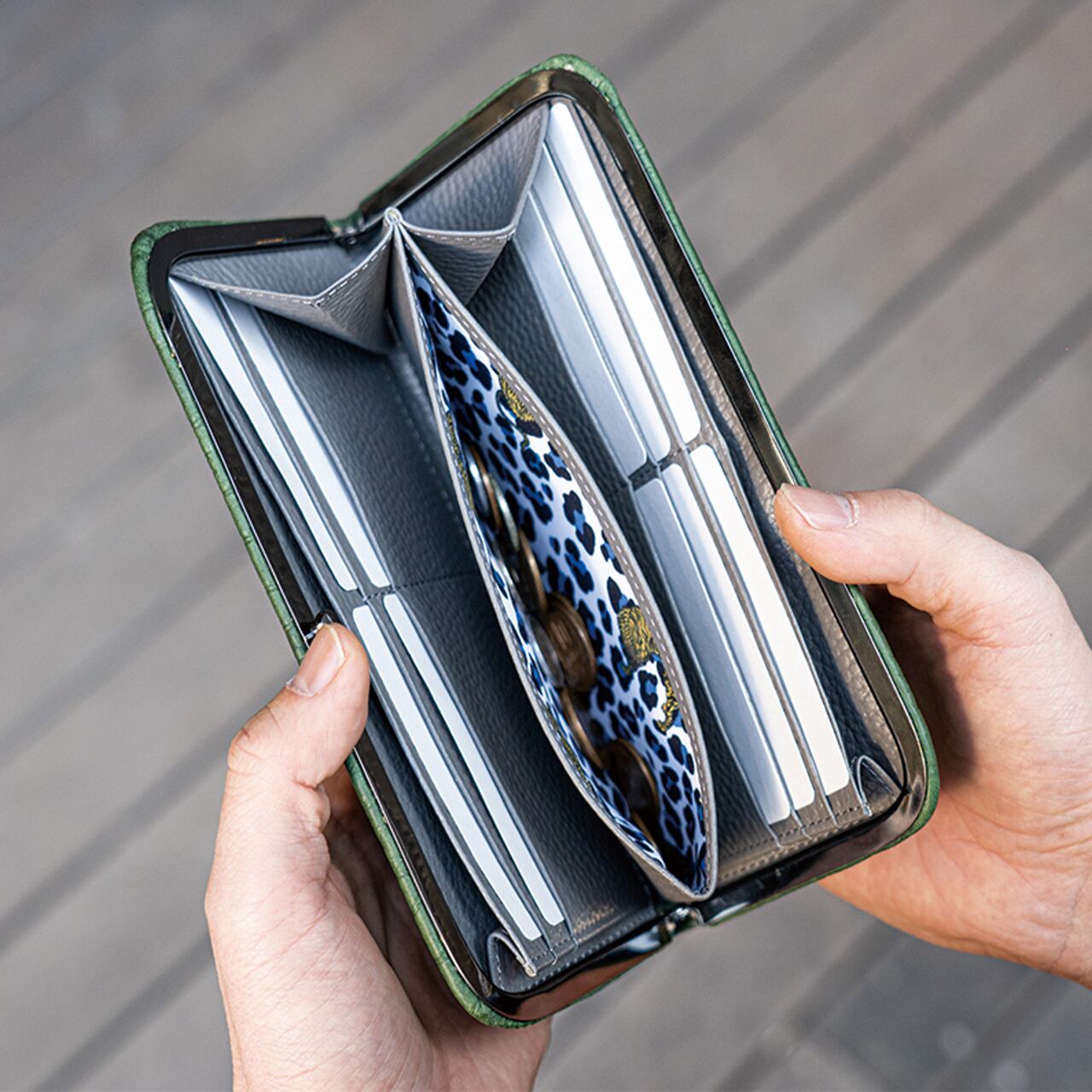 ワンタッチで簡単に開閉する薄型財布「天溝LONG」です。口が大きく開くので中身の視認性が高く、手の収まりが良いのが特徴です。がまぐち一筋50年の熟練職人と作るキャッシュレス時代に丁度よい薄型でかさばらない新しいタイプのロングウォレットです。