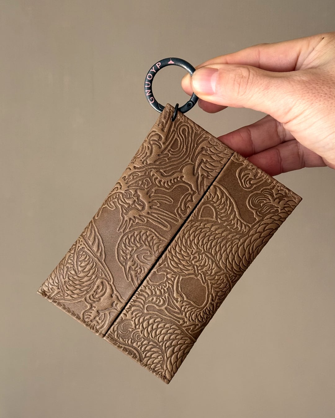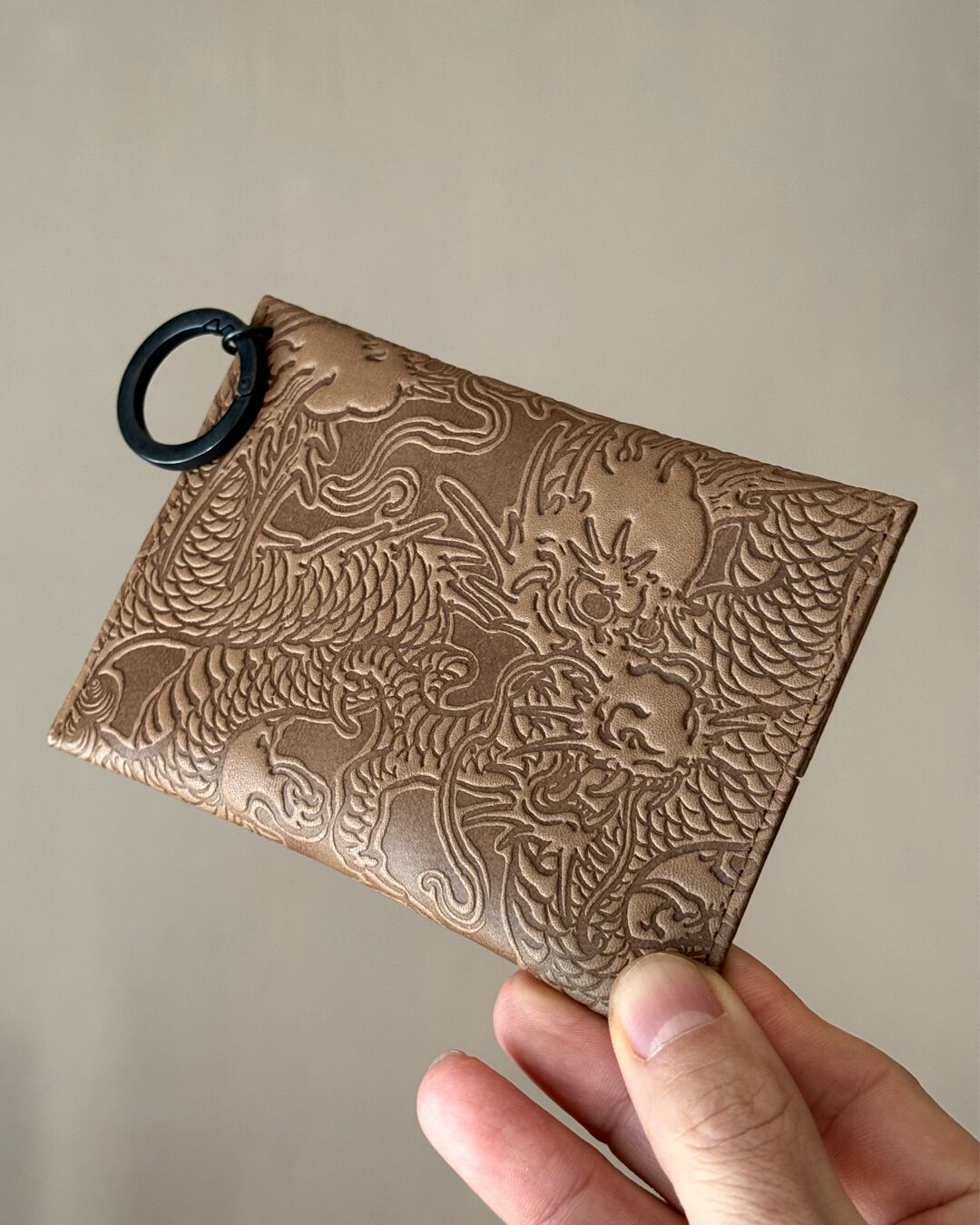 オイルをたっぷり含ました牛革に文身師で画家のOT氏描き下ろし「神龍」の型押しを施しました。使い込むと馴染んでいきとても良い艶が上がってきます。